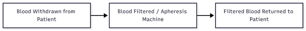 Therapeutic apheresis is a specialized procedure in which your blood is circulated outside the body, where it is filtered and returned to you in a modified form. Conceptually, our patients often find it helpful to think of it as “similar to dialysis,” where blood passes through an extracorporeal circuit, but the goals are different. Dialysis removes waste products in kidney failure, whereas apheresis removes specific plasma components such as lipoproteins, fibrinogen, or immune complexes.