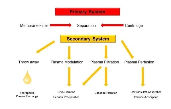 For the first step (Primary System – the plasma separation – this is where white blood cells and red blood cells and blood platelets are separated from the rest of the blood, the yellowish liquid called blood plasma) there exist 2 systems to achieve this: filtration with a membrane or using a centrifuge.